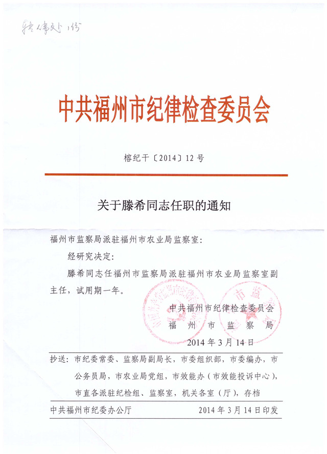 关于滕希同志任职的通知