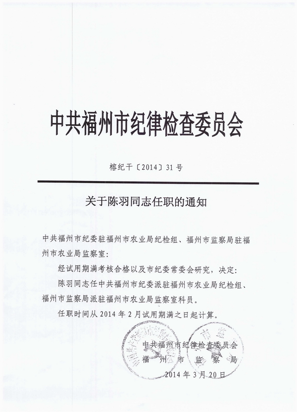 关于陈羽同志任职的通知