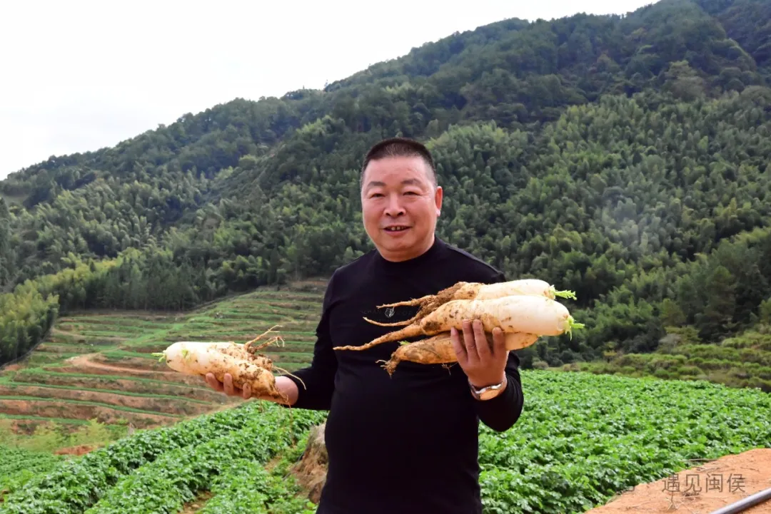 林立平举起即将丰收的白萝卜。图源:遇见闽侯