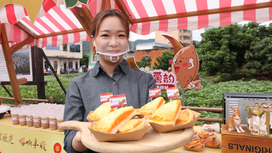 创意美味芝士焗红薯披萨、番薯丸、番薯奶茶、番薯咖啡……等“专薯盛宴”浓香四溢,吸引游客品尝购买。