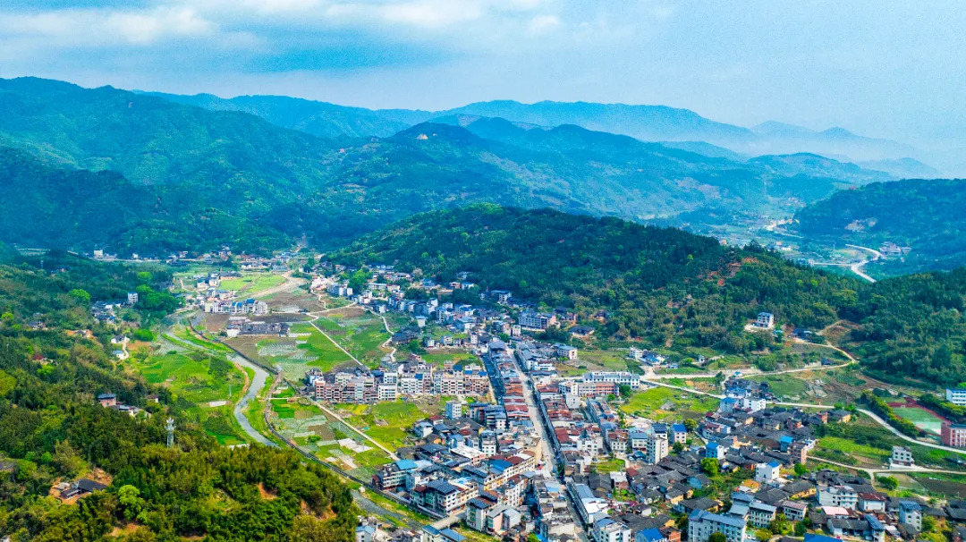 上莲乡政府所在地就居于四周皆山的盆地中,从镇子沿着山道上山,俯望村庄、田园、溪流尽收眼底。山上,白墙黑瓦的房屋仿佛嵌在云端。