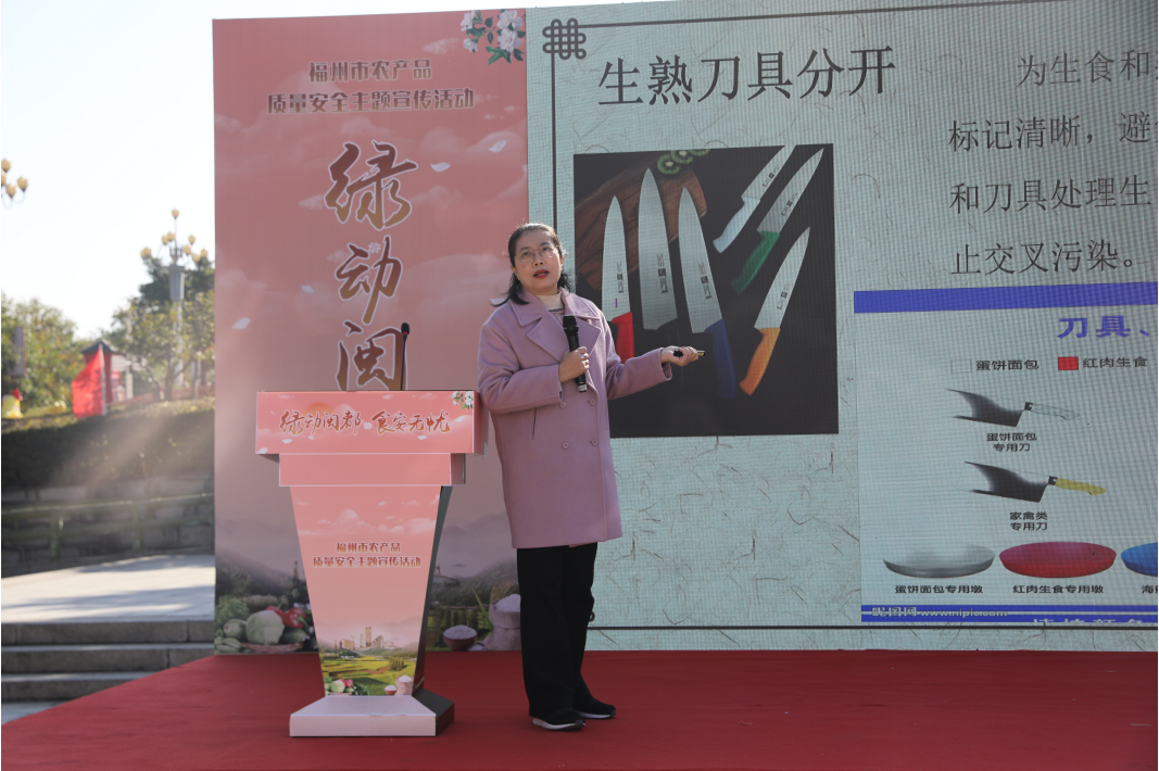 活动中,福建省农林大学教授方婷为群众科普家庭生熟菜板和刀具、泡发制品、冰箱食品安全隐患以及食品包装等注意事项。网格协管员及生产主体进行达标合格农产品亮证行动承诺宣誓。